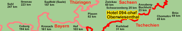 Oberwiesenthal (51 km), Plauen (88 km), Leipzig (88 km), Jena (89 km), Hof (95 km), Dresden (96 km), Karlsbad / Tschechische Republik (99 km) und Prag / Tschechische Republik (180 km).